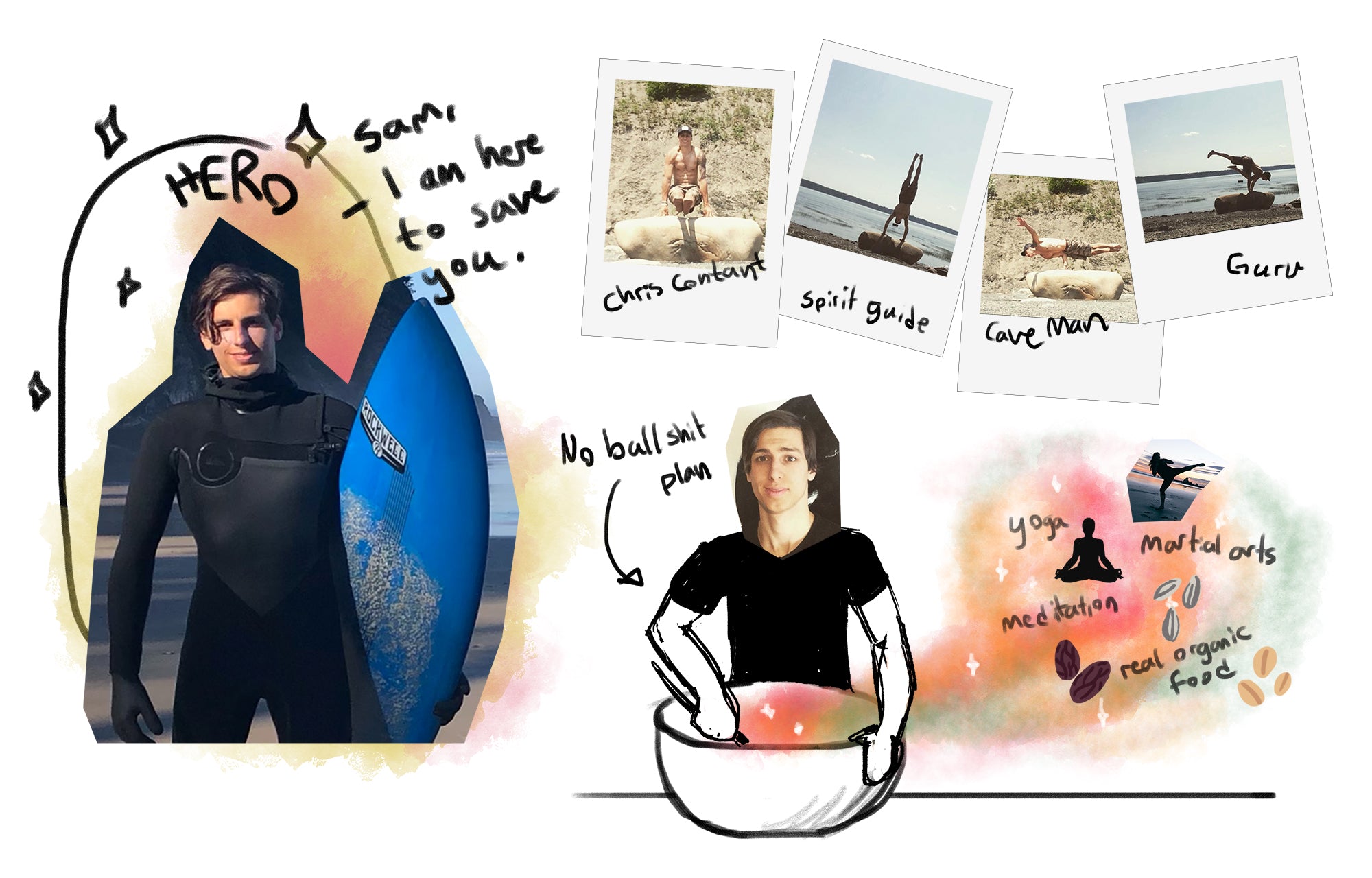 Eventually, one of Sam’s best friends connected him with Chris Contant, a holistic health nut and yoga teacher who had recently moved back from British Columbia where he studied at the Canadian School of Natural Nutrition. An avid surfer, free-skier, and hardcore outdoorsman obsessed with natural foods, he’s “part caveman, part guru, part spiritual guide,” says Sam, and has a pantry stocked with supplements, superfoods, and chaga mushrooms that he harvested in the forest. He drafted Sam an alternative health plan, one without medications or trendy shortcuts. Instead, it focused on a mix of daily movement (yoga, meditation, martial arts) and a diet rich in real, organic food.