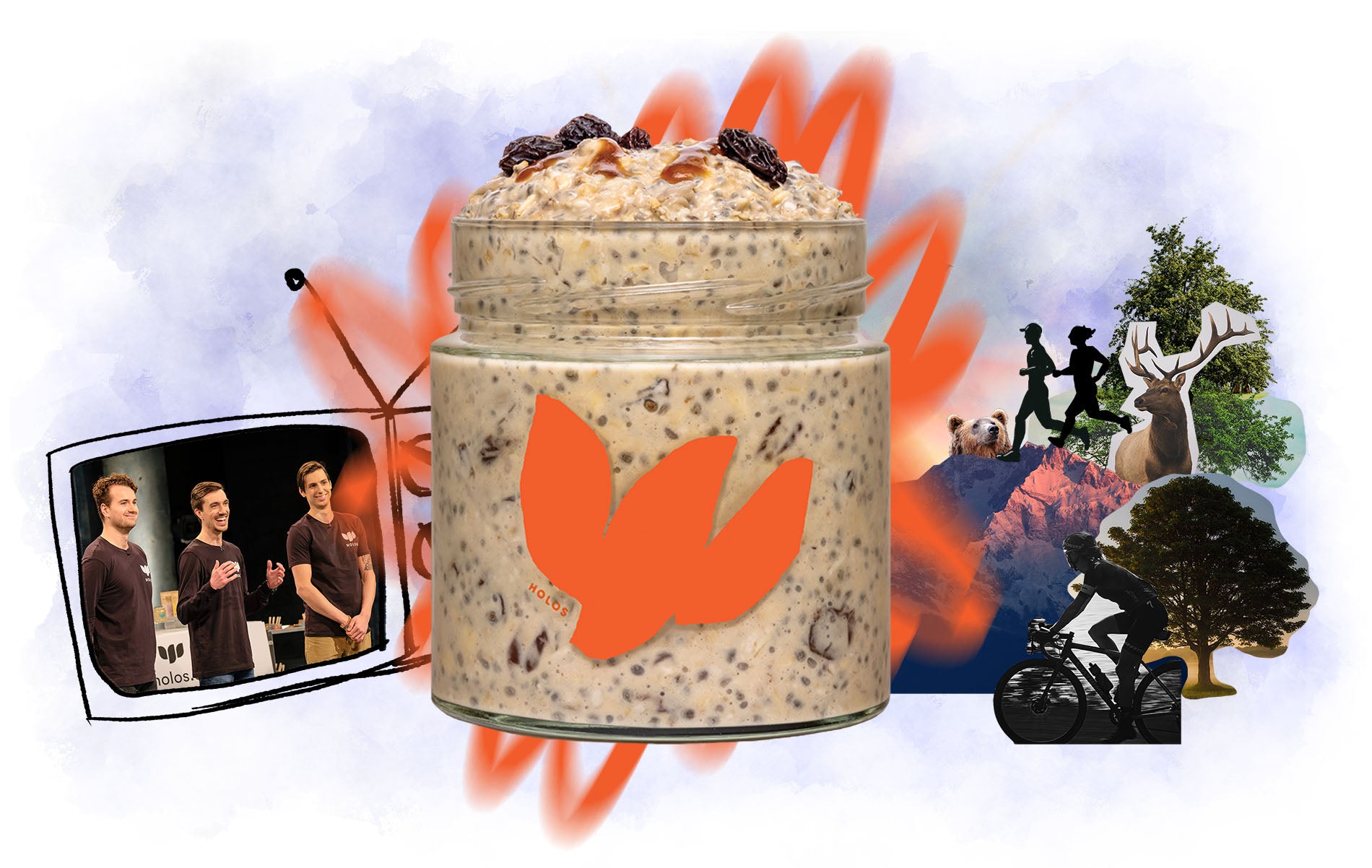When years of hustling in tech startups wreaked havoc on Sam's health, the Quebec City entrepreneur went looking for answers. His curiosity led him to a holistic health coach named Christophe Contant who prescribed him a daily regimen of movement, nature, and whole foods. It worked. One recipe in particular–a turbocharged twist on Bircher muesli that soaks overnight to be eaten in the morning–changed his life, restoring his energy levels and helping to heal his gut. They knew they had something big. Over the next two years, Sam, Chris, and an angel investor-turned-CEO named Charles Sansregret developed and perfected the product of their dreams: a magic muesli nutritious enough to help you go the distance, whether you're in the last stretch of an marathon or on your third all-nighter with a newborn. They called it HOLOS, derived from the Ancient Greek word holo ὅλος, meaning "whole,” because of everything it is and aspires to be: the breakfast of champions and casual joggers, a real-food revolution in a reusable jar.