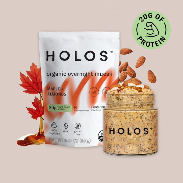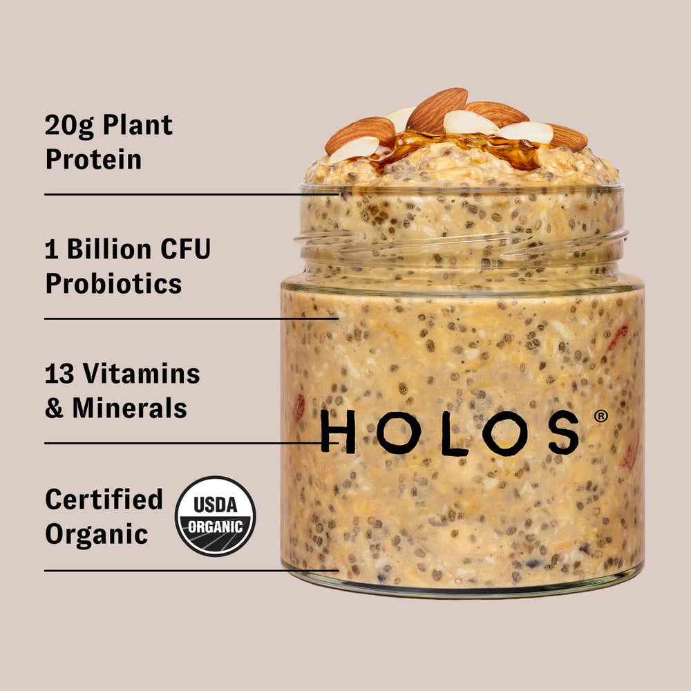 Rolled oats*, Roasted almond pieces*, Sprouted brown rice protein powder*, Chia seeds*, Dried Goji berries*, Dried white mulberries*, Maple sugar*, Natural flavour*, Guar gum*, Himalayan pink salt, Mesquite powder*, Bacterial culture (Bacillus coagulans GBI-30 6086). Contains: Almonds. May contain: Peanuts, Hazelnuts, Walnuts, Cashews, Pecans, Brazil Nuts, Macadamia Nuts, Pistachios, Pine Nuts, Coconut and Sesame.